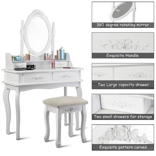 Goplus Goplus Tri Folding Mirror White Wood Vanity Set Makeup Table Dresser 4 Drawers Stool